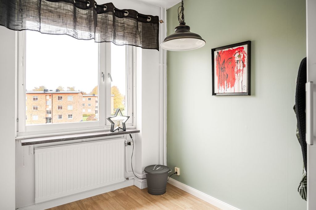 Ekparkett på golv och ljusgrå färg på väggarna, här finns även utgång till balkongen.Kök