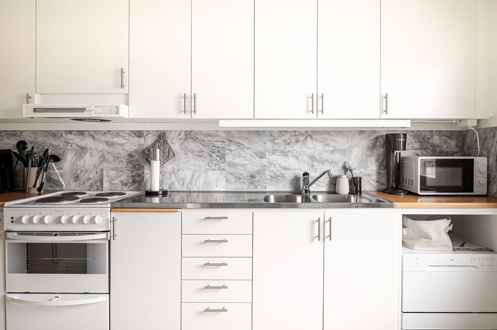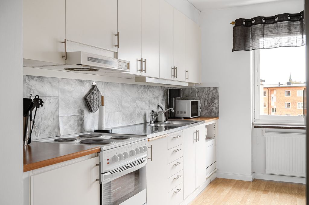 Ljust trämönstrat laminatgolv och vitmålade väggar samt en ljusgrön fondvägg vid matplatsen. Vitt köksinrede med rostfri diskbänk samt trämönstrad laminatbänkskiva, kakel ovan köksbänk är beklätt med marmormönstrad kakeldekor.
