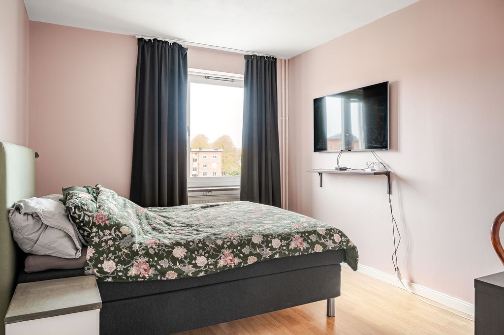 Här finns 2st garderober som erbjuder bra klädförvaring och ett stort fönster som bjuder på naturligt ljusinsläpp.Badrum