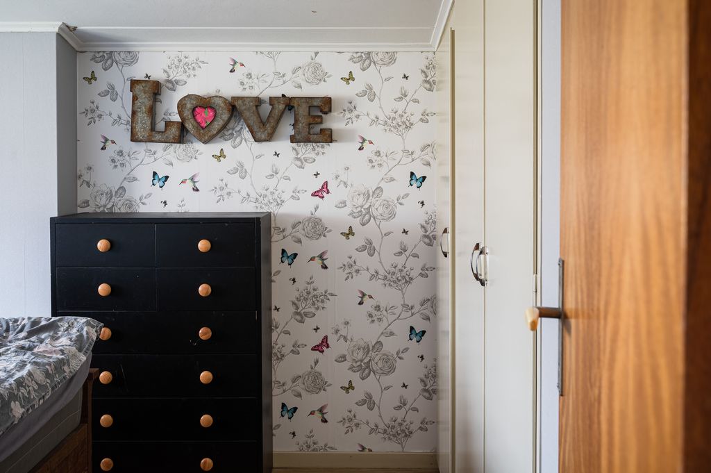 Plastmatta på golv och träpanel i tak. SidovindSovrum