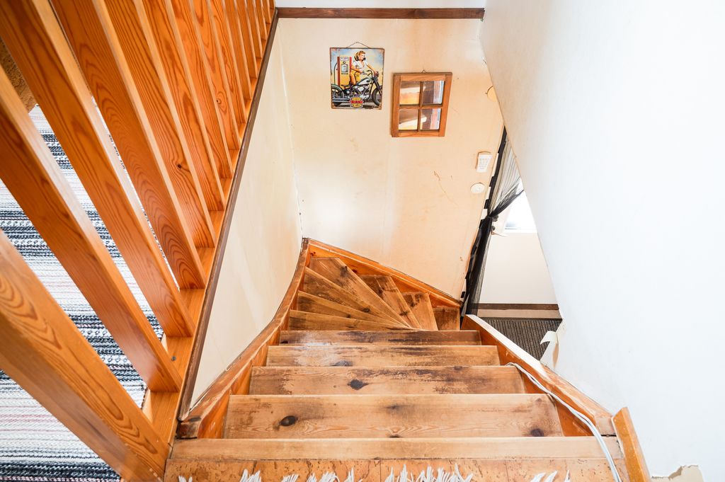 Trappa upp till övervåning, plastmatta på golvBadrum