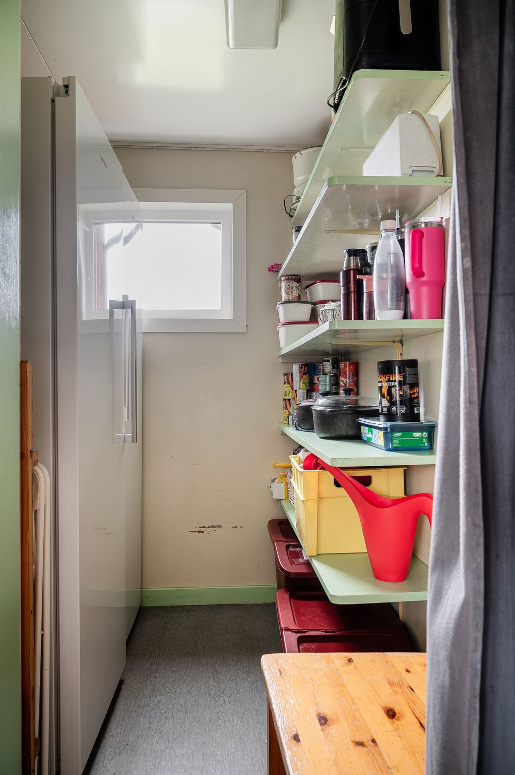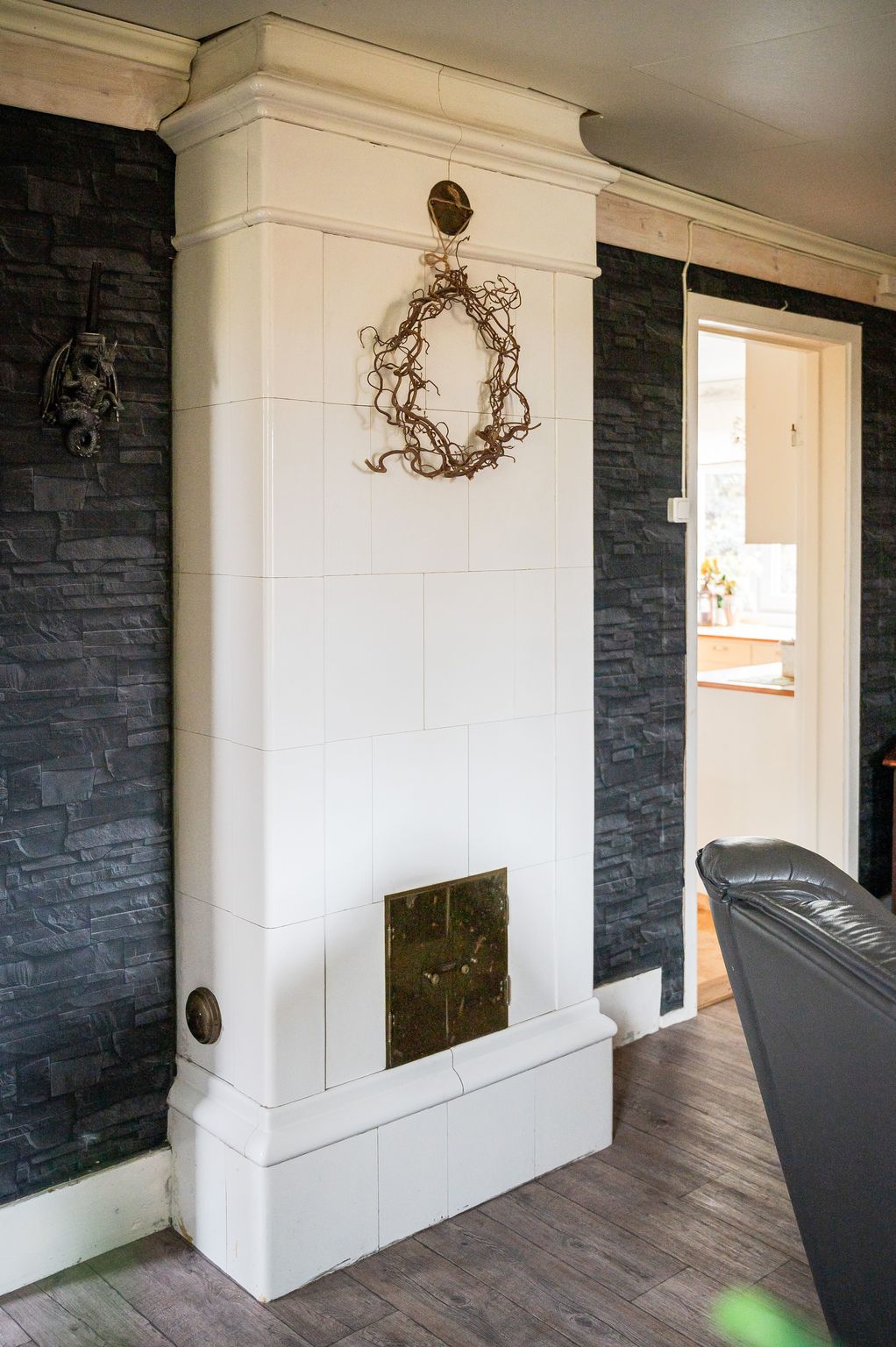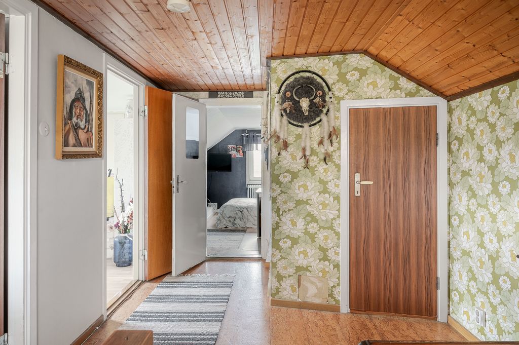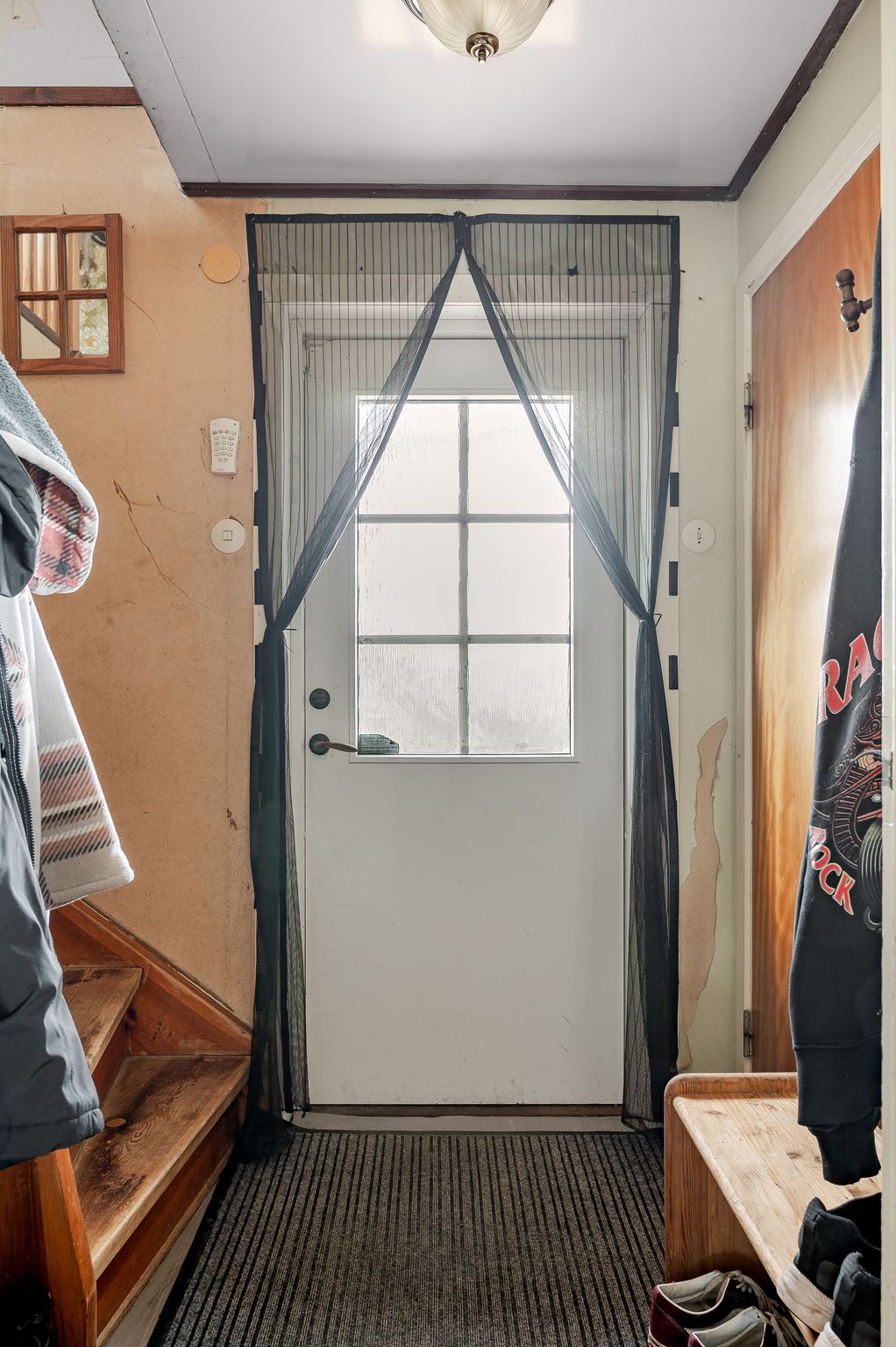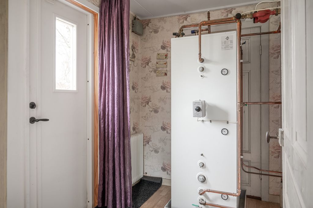 Plastmatta på golv, träpanel på väggar samt kakelugn (ej fungerande)Hall/huvudentre med plastmatta på golv, ack.tank.
