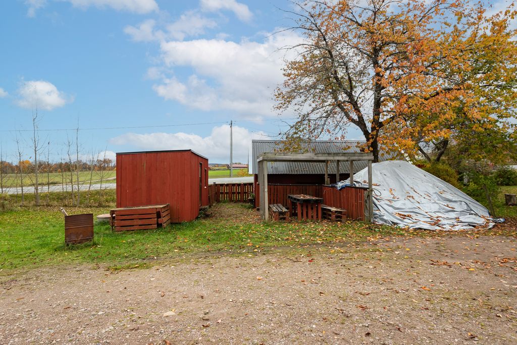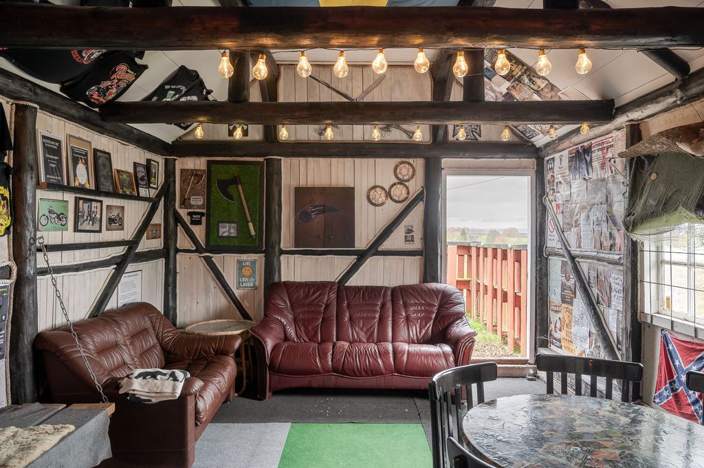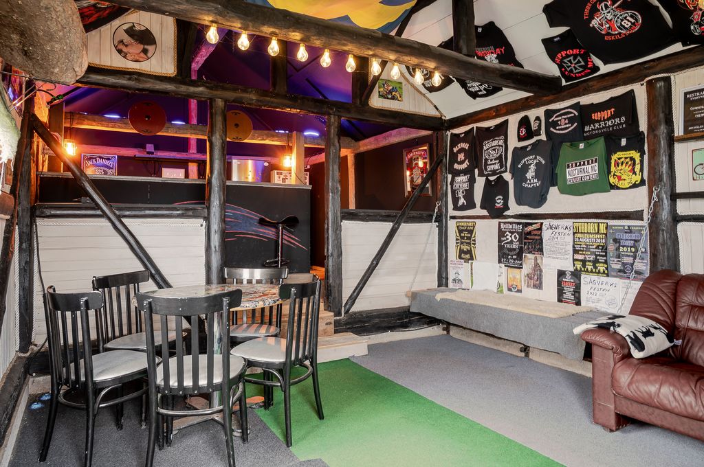 Träbyggnad inredd till bar o sällskapsyta, takhöjd upp i nock, här finns el indraget. Vedförråd vid sidan av byggnaden. Uteplats med plats för grill o utebar.