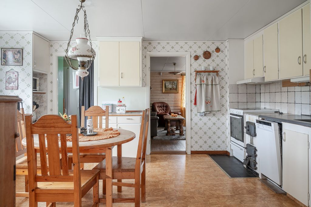 Plastmatta på golv, gult köksinrede, spis, fläkt, diskmaskin 5år, frys 3 år, kyl, skafferiSovrum/arbetsrum plastmatta på golv.