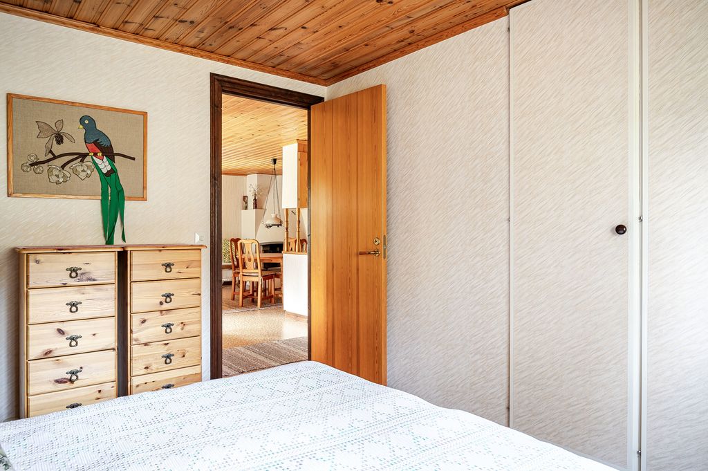 Plastmatta på golvet och panel i taket. Två garderober ger gott om förvaringsutrymme.Sovrum