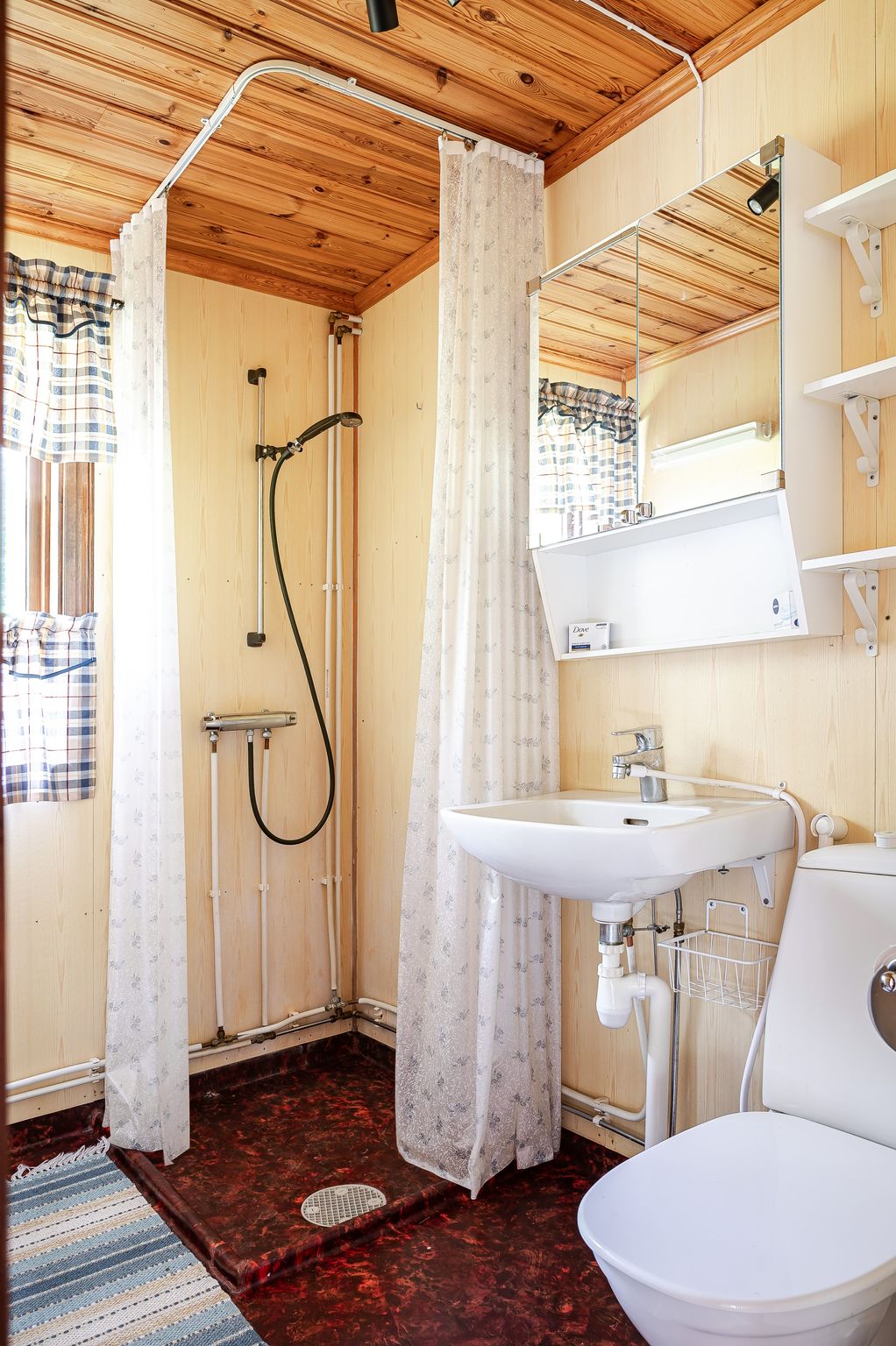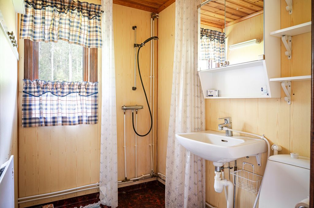 Våtrumsmatta på både golv och väggar samt panel i taket. Utrustat med tvättställ, wc och dusch. Element i badrum fungerar bristfälligt.Kök och allrum