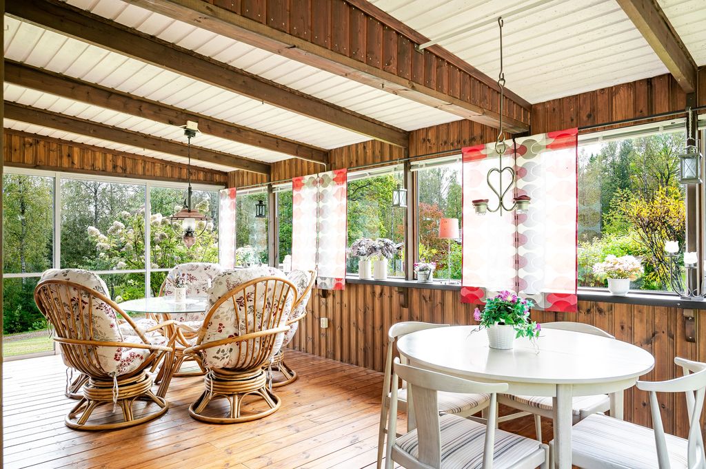 Plastmatta på golvet och panel i taket och delvis på väggar. Utrustat med spis, kyl/frys, fläkt och öppen spis. Härifrån finns utgång till en stor inglasad altan.Inglasad altan