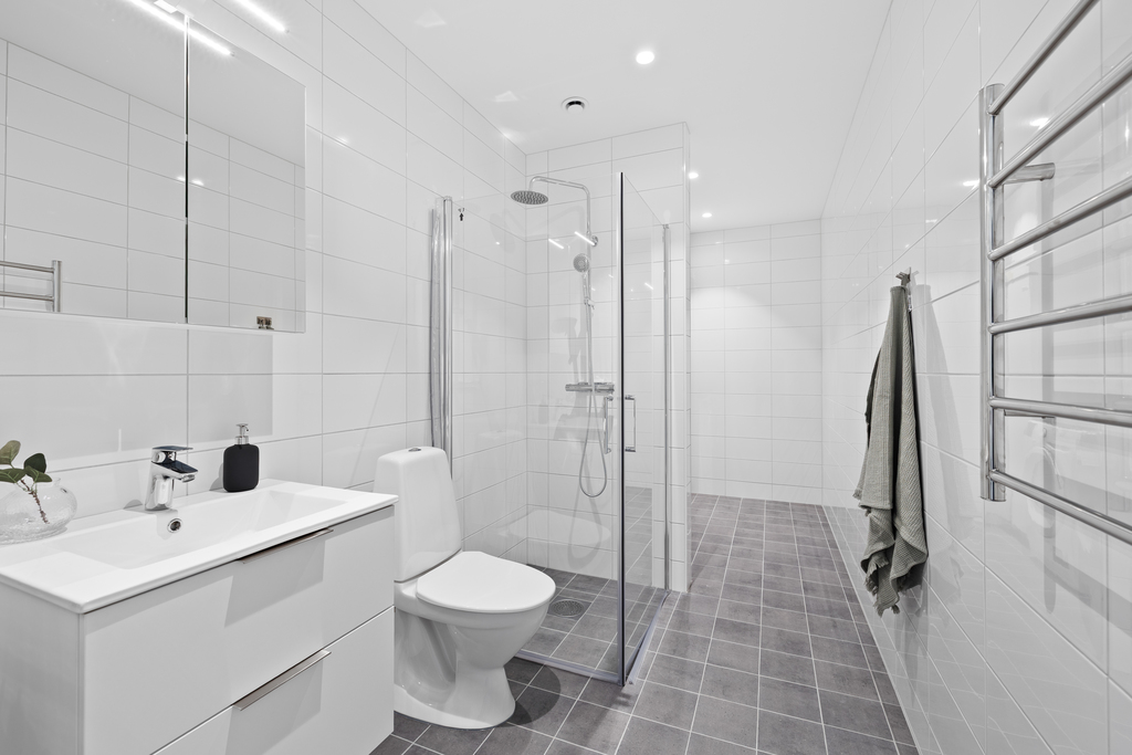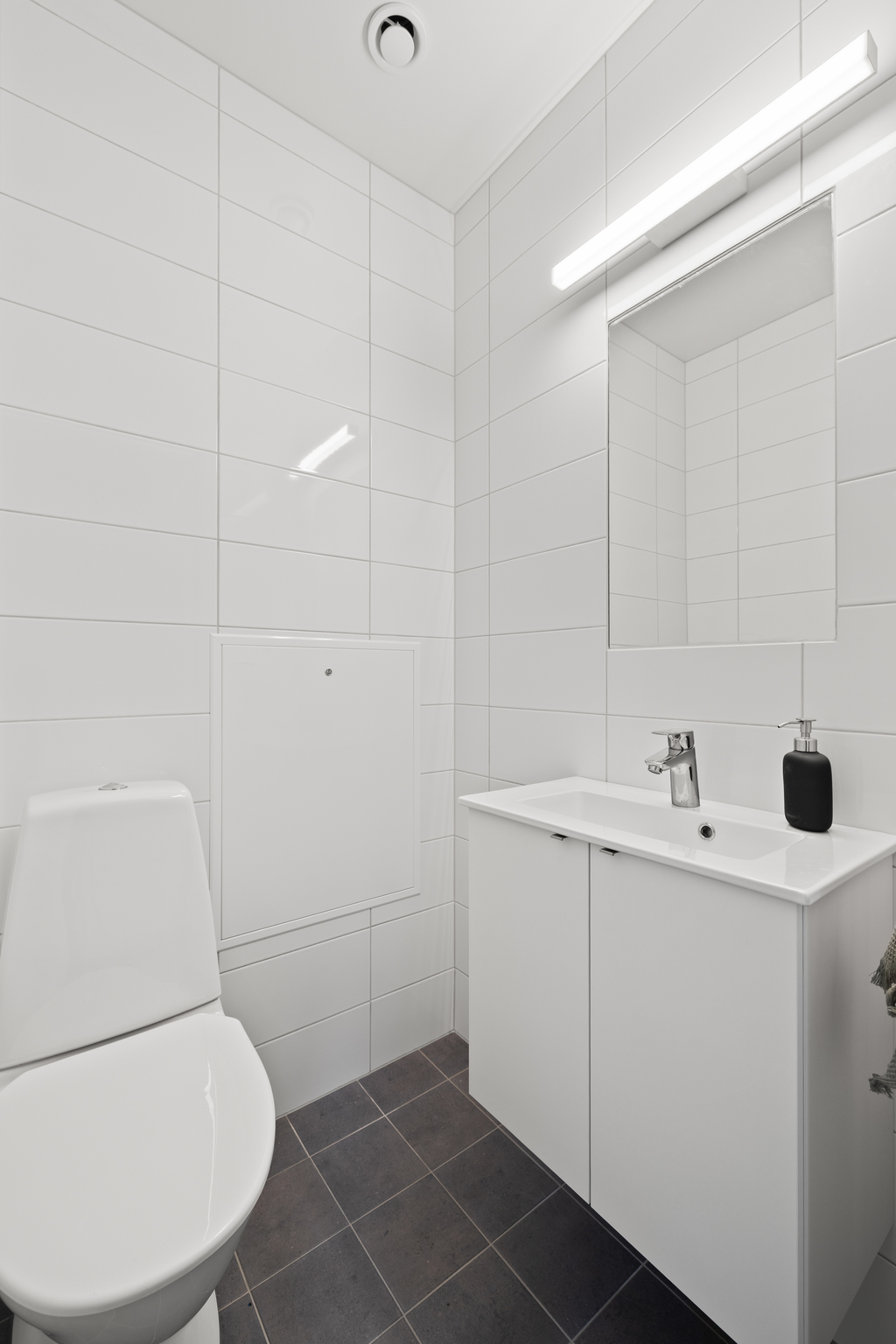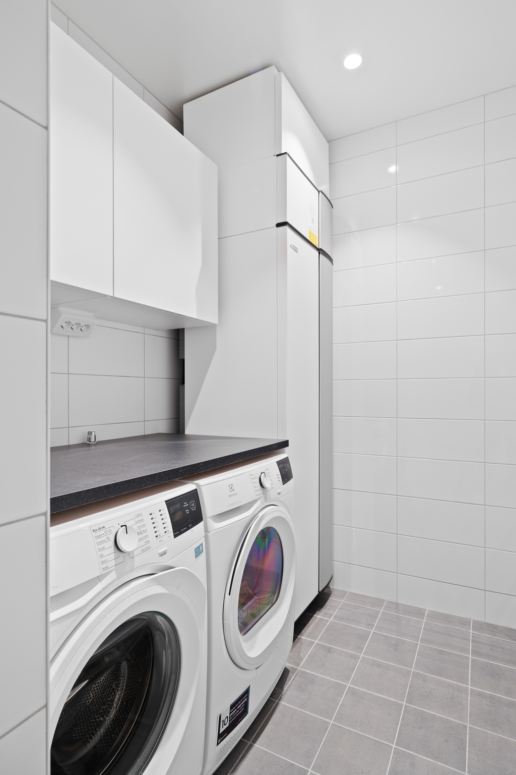 Grått klinker på golv och vitt kakel på väggar. Badrumsinredningen består av badrumsskåp, kommod och tvättställ, handdukstork, duschhörna med glasdörrar. Tvättavdelning med tvättmaskin och torktumlare, badrumsskåp samt värmepump.