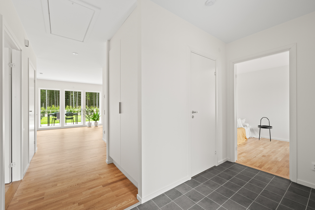 Klinker på golv som övergår i 3-stavsparkett. Målade väggar. Förvaring i form av skjutgarderober /städskåp samt hatthylla.