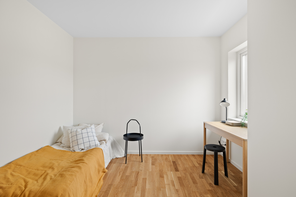 Golvbeklädnad i 3-stavsparkett och målade väggar. Här finns 1 garderob.