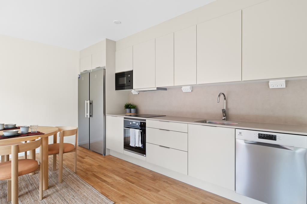 HTH kök, med bänkskiva i laminat. Maskinell utrustning från Bosch består av kyl, frys , spishäll, köksfläkt, diskmaskin och mikrovågsugn. Golvbeklädnad 3-stavsparkett, målade väggar.