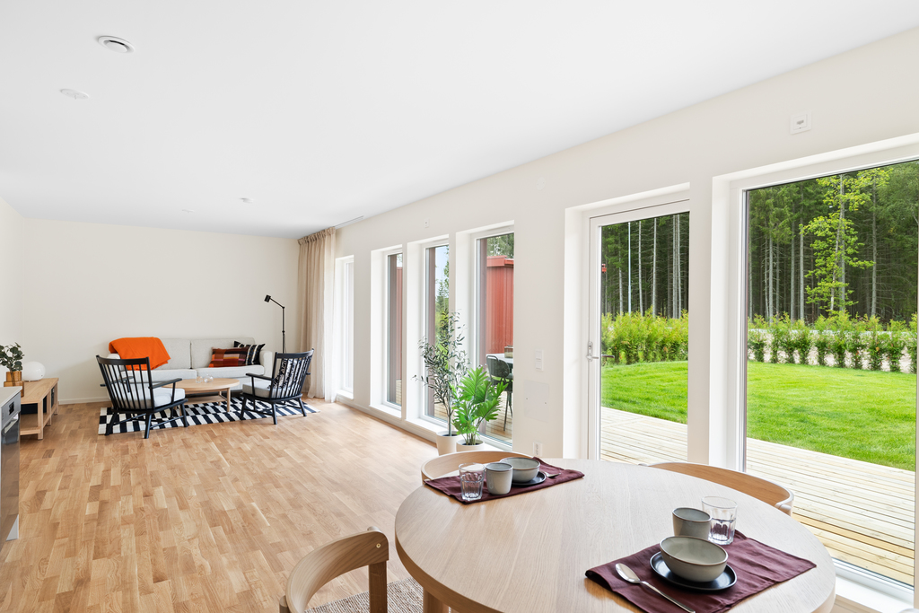 Vardagsrum med stora fönsterpartier och utgång till altan samt trädgård. Golvbeklädnad av 3-stavsparkett, målade väggar.