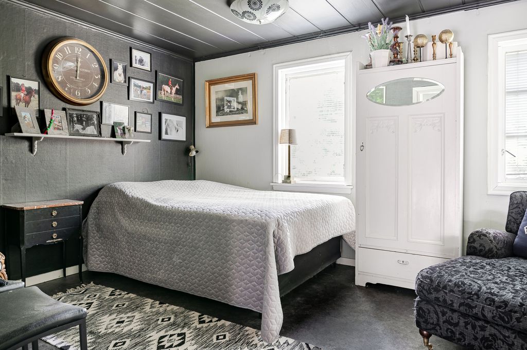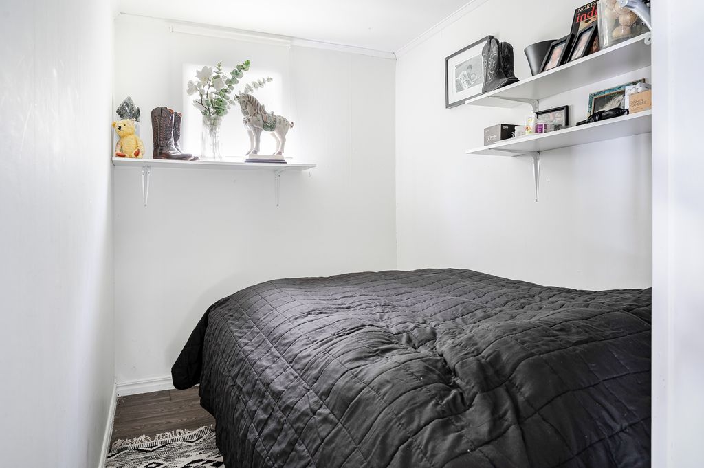 Valnötsmönstrad plastmatta på golv och vitmålade väggar.Sovrum