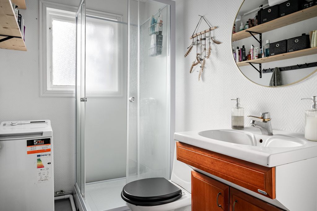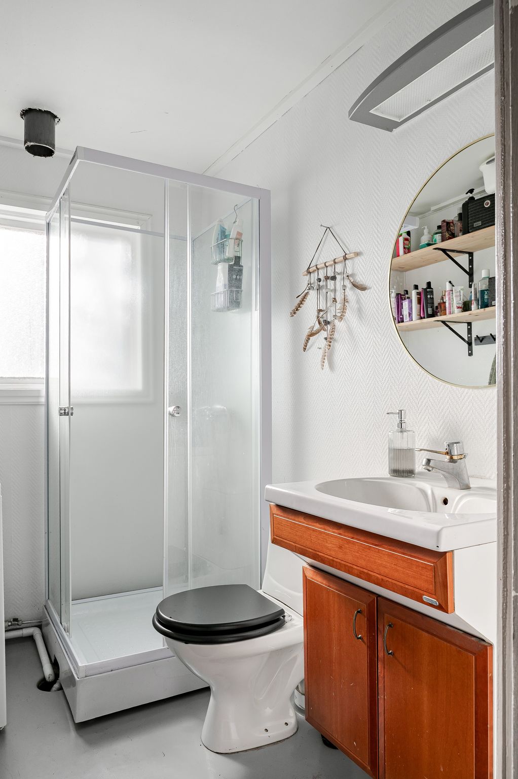 Utrustat med duschkabin, wc, kommod med förvaring samt spegel & badrumsbelysning.