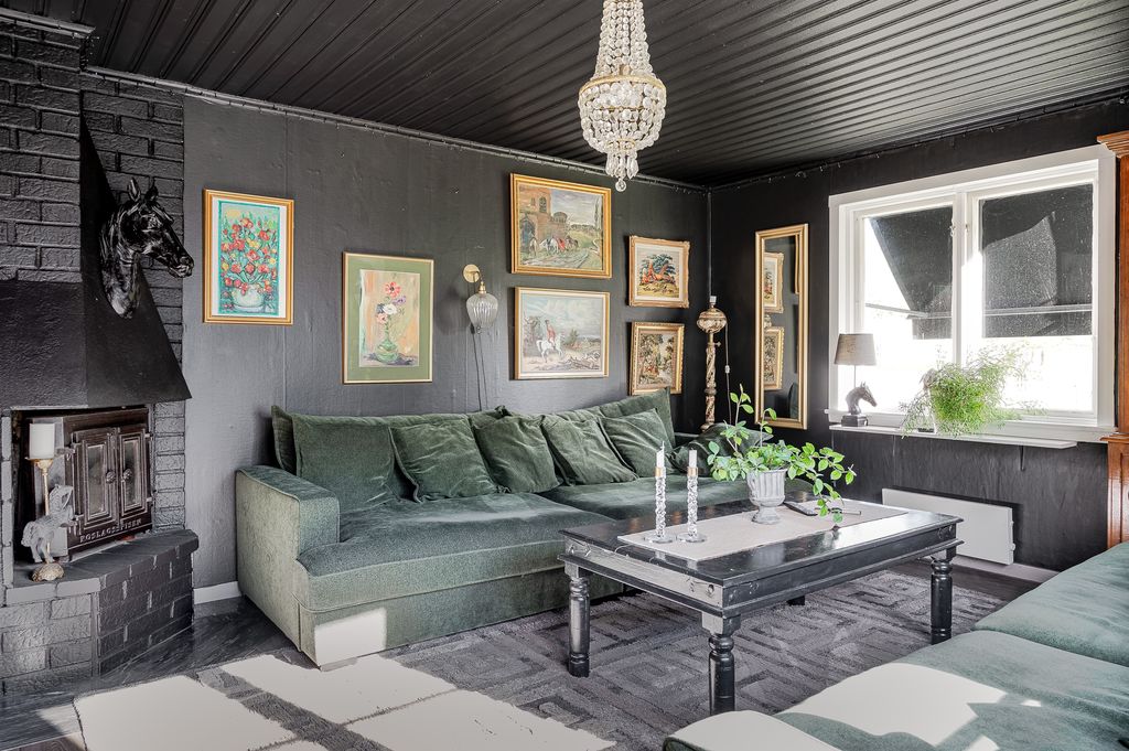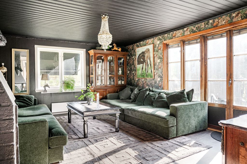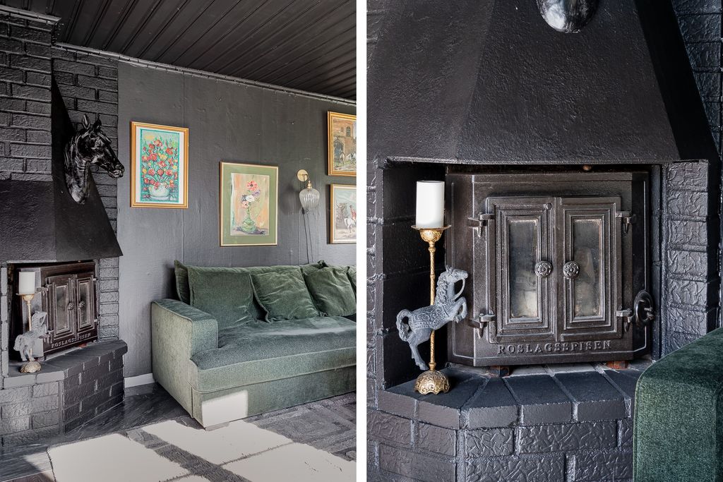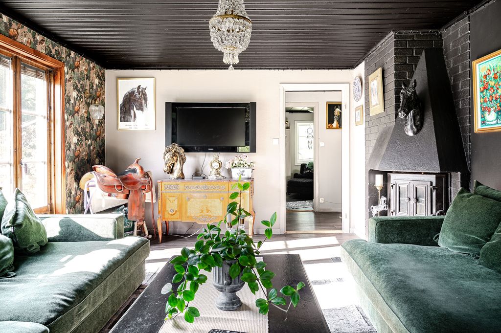 Här finns eldstaden placerad samt utgång till altan i grönskande läge.Kök