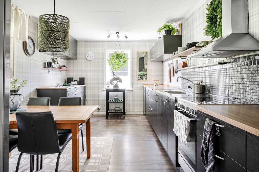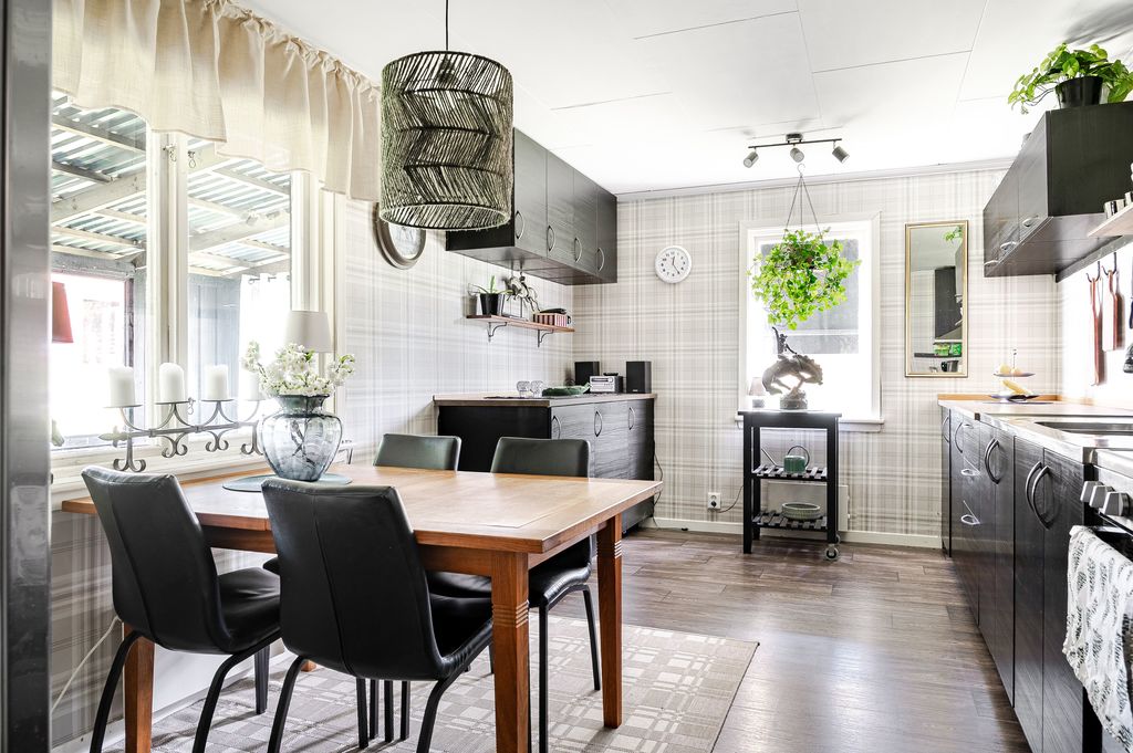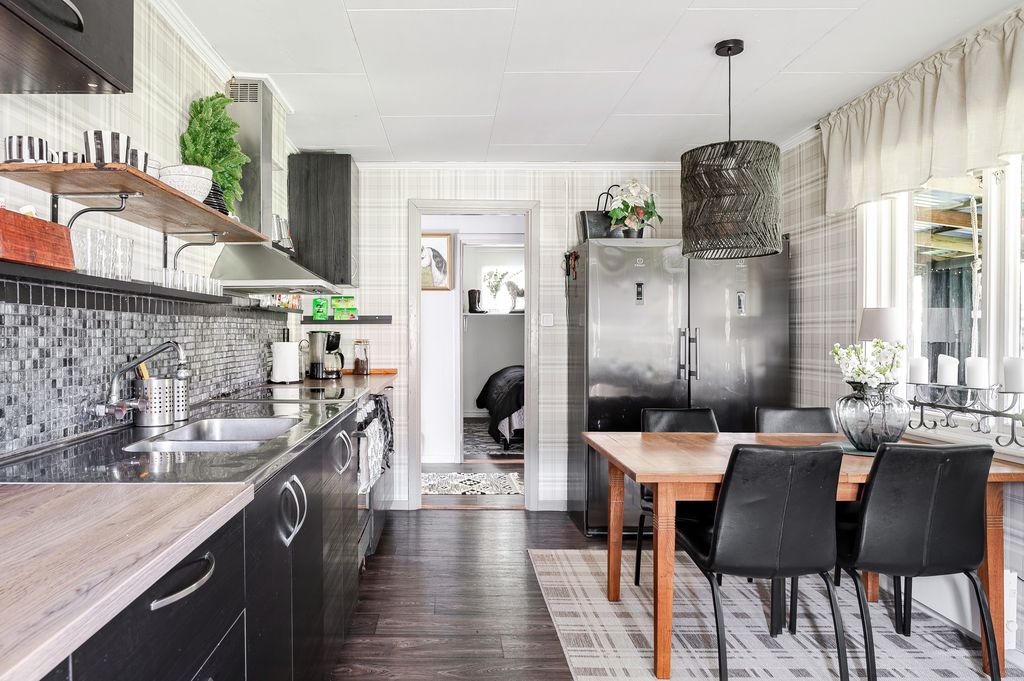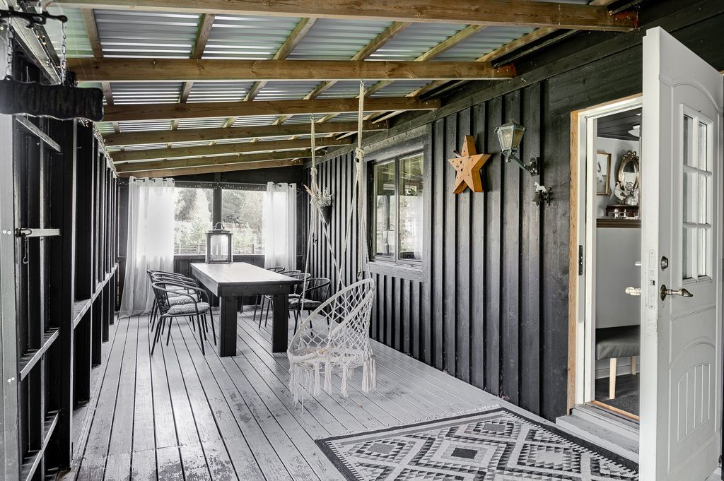 Utrustat med kombinerad ugn/induktionshäll, köksfläkt samt kyl & frys i rostfritt utförande.Uterum