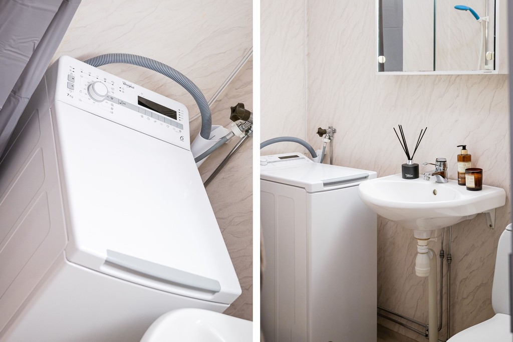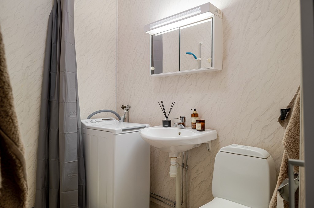 Badrum med våtrumsmatta på golv och väggar. Badrummet är utrustat med tvättmaskin, duschhörna, tvättställ o wc-stol.