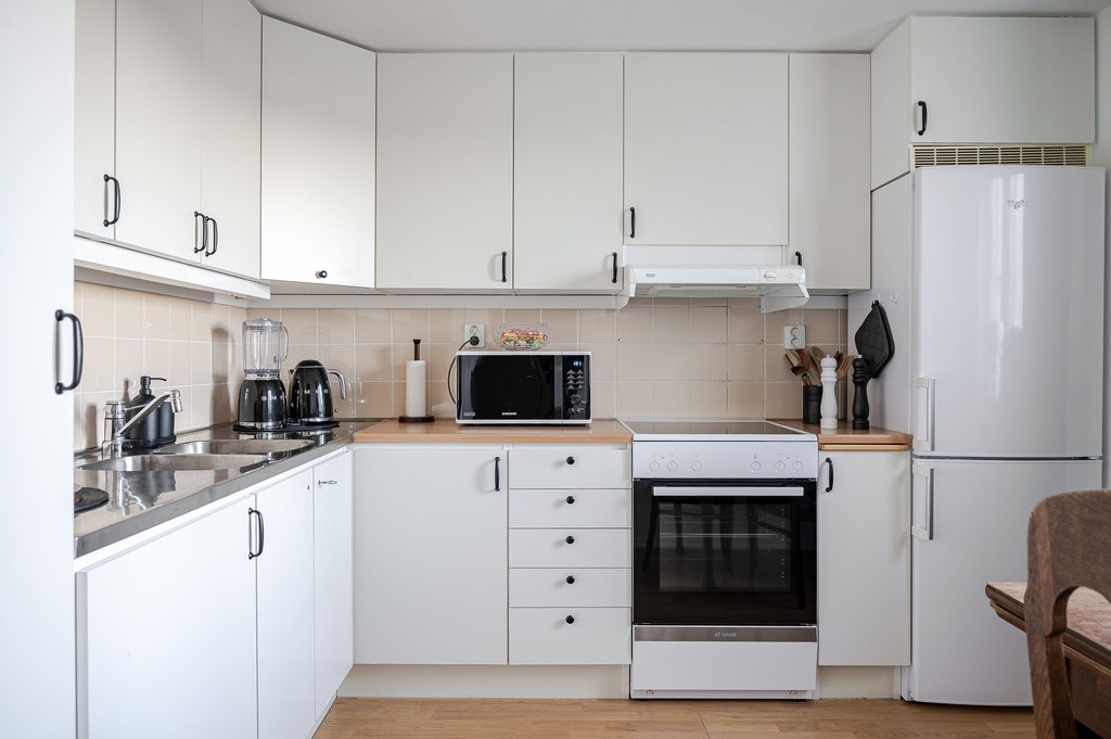 Laminatgolv och vita köksluckor. Köket är utrustat med spis, kyl/frys och fläkt.