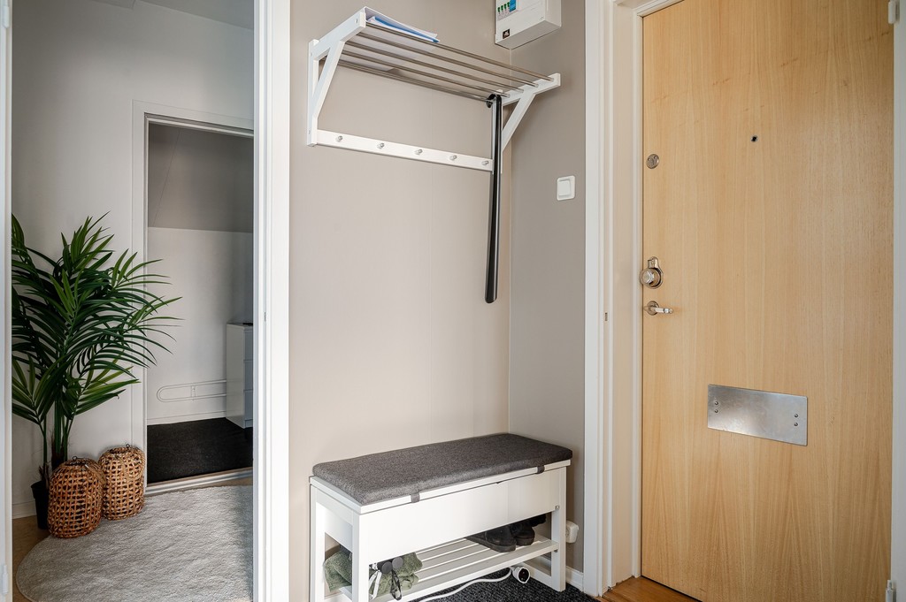 Välkommen in till Hjälmgatan 8! I hallen är det plastmatta på golv.