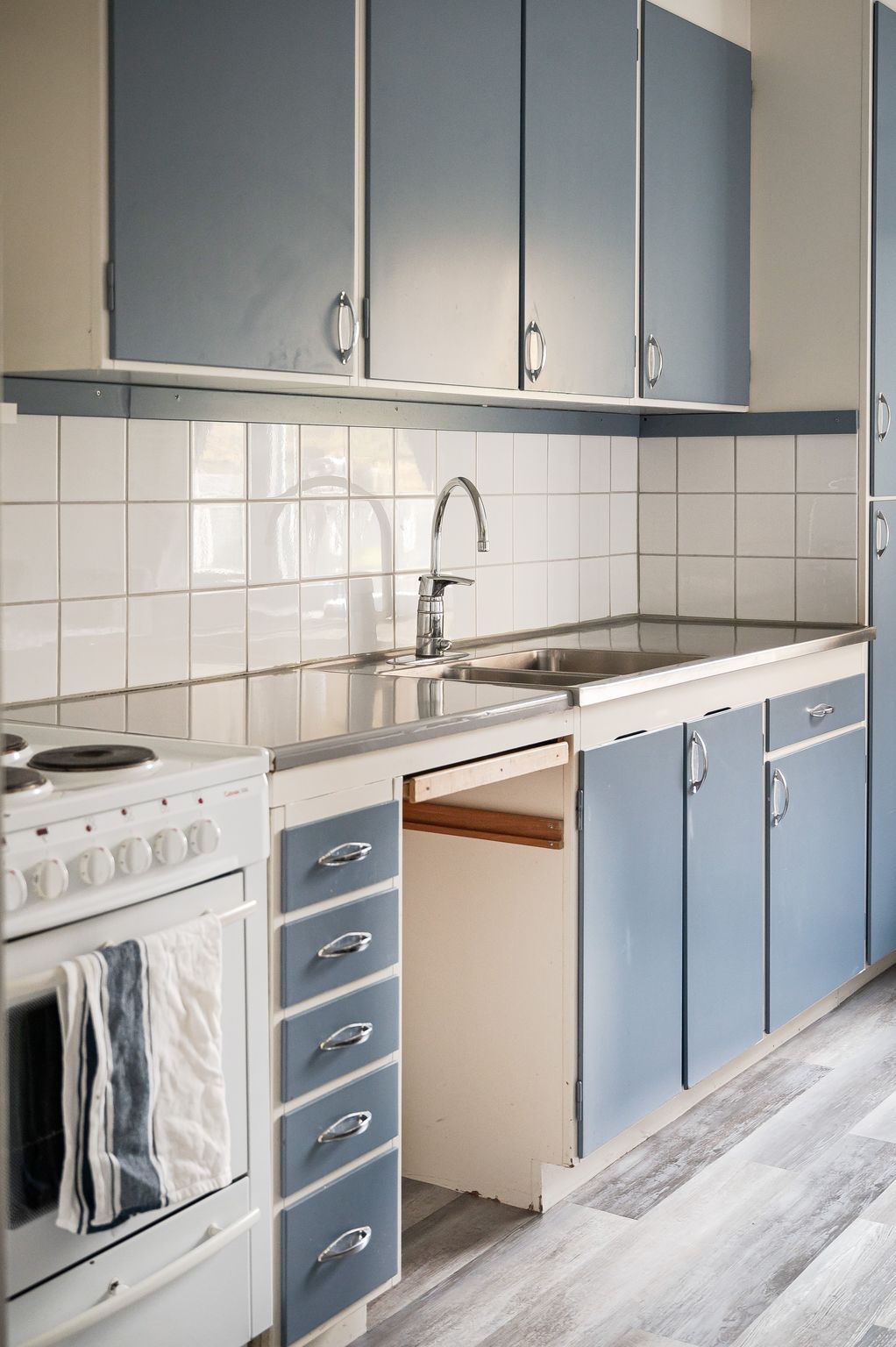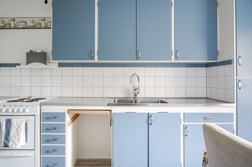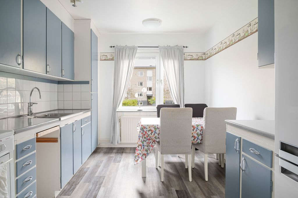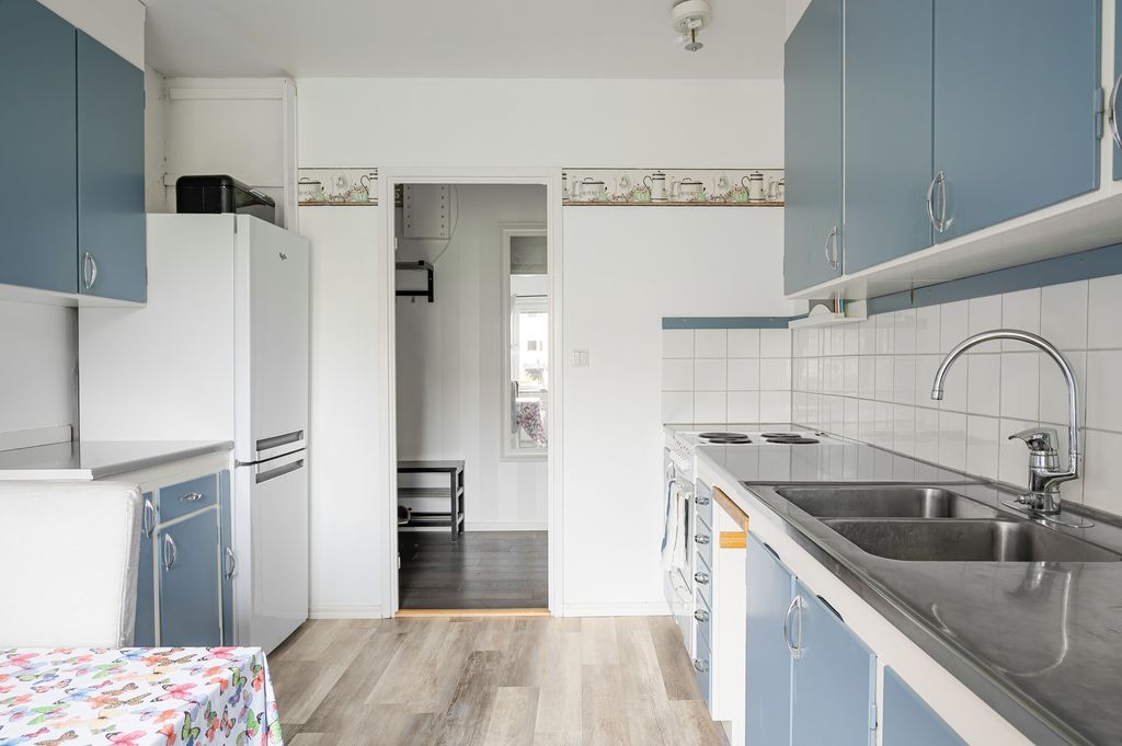Trämönstrat laminatgolv och vita väggar med blått köksinrede och vitt kakel ovan diskbänk.