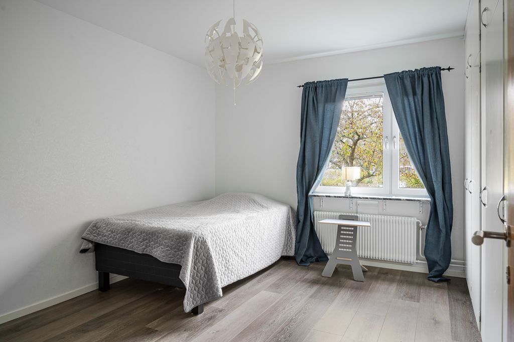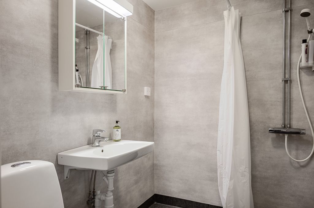 Vidare är badrummet utrustat med Wc-stol, duschhörna, tvättställ samt spegelskåp med förvaring samt belysning.Sovrum
