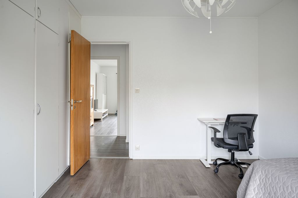 Rymligt sovrum med trämönstrat laminatgolv och vitmålade väggar.