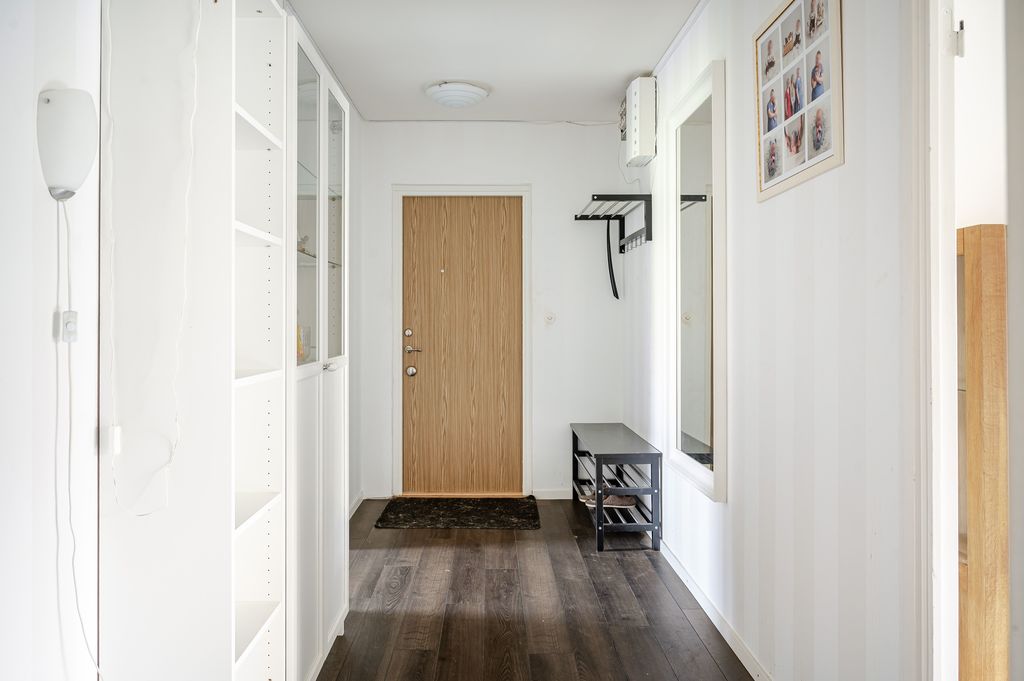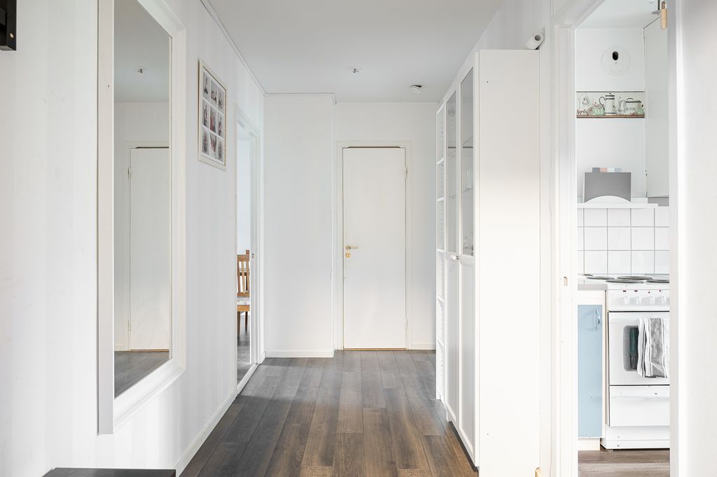 Rymlig hall med trämönstrat laminatgolv och vita väggar.