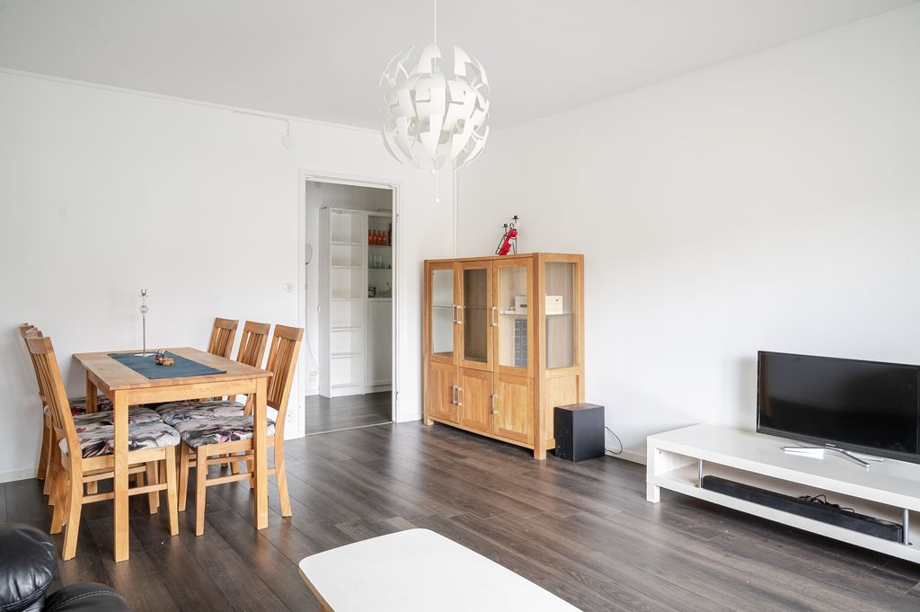 Väl tilltaget vardagsrum med trämönstrat laminatgolv och vita väggar med utgång till balkong.