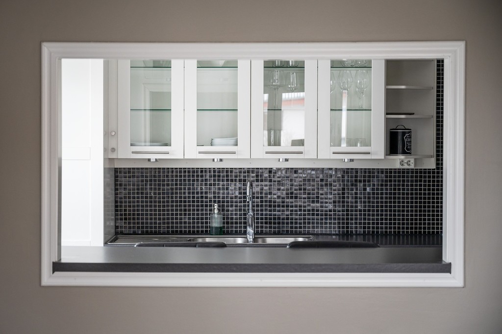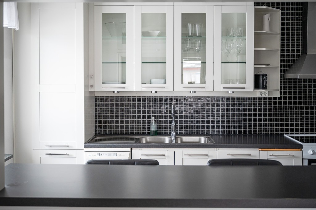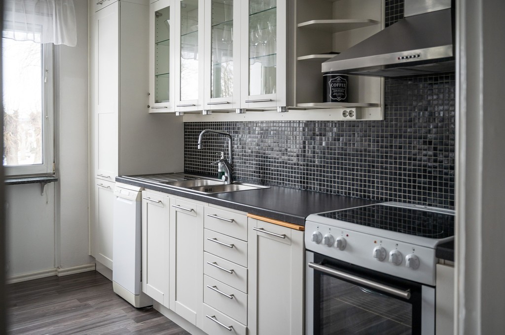 Vitt kök från Marbodal med öppet mot vardagsrum. Maskinell utrustning består av diskmaskin, spis, kyl/frys och fläkt.