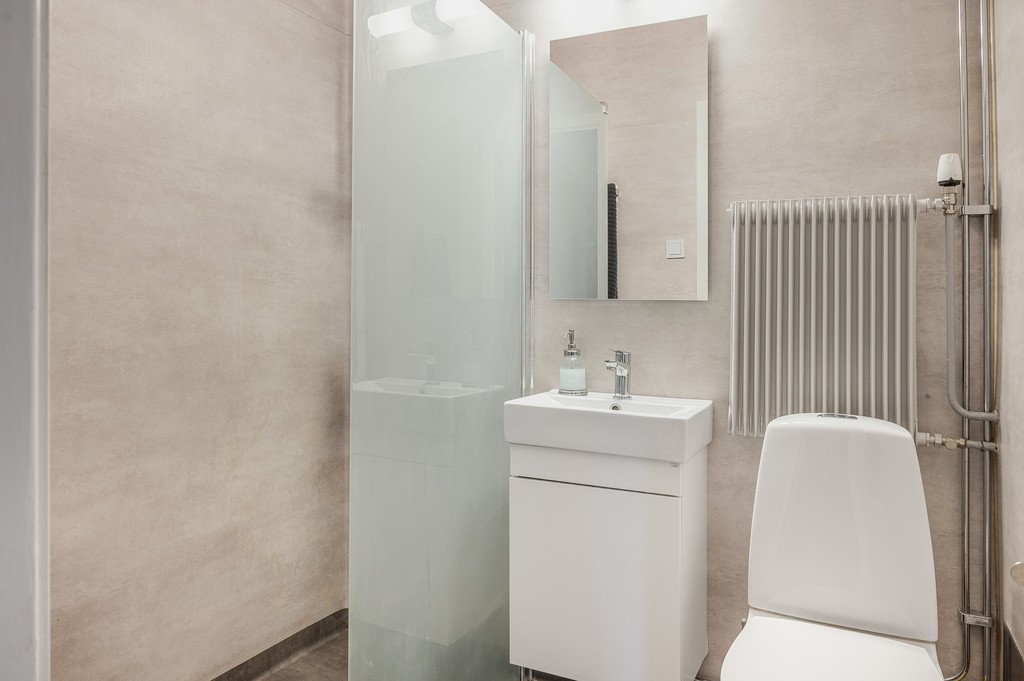 Renoverat badrum med våtrumsmatta i grått. Renoverat ca 2019. Duschhörna med glasvägg, wc, tvättställ.