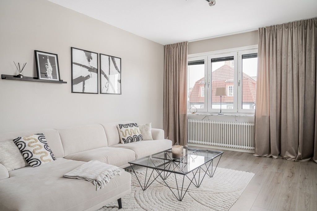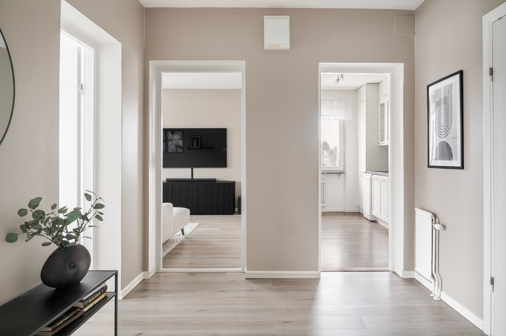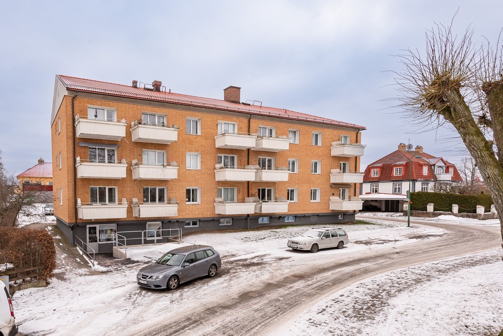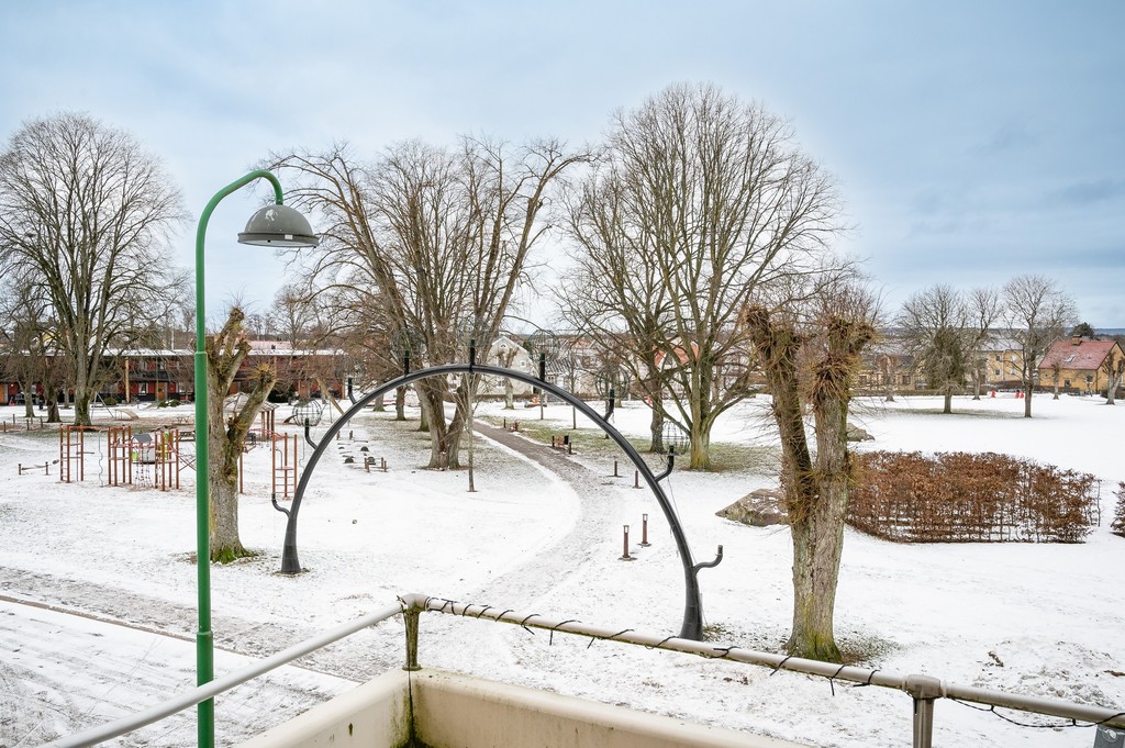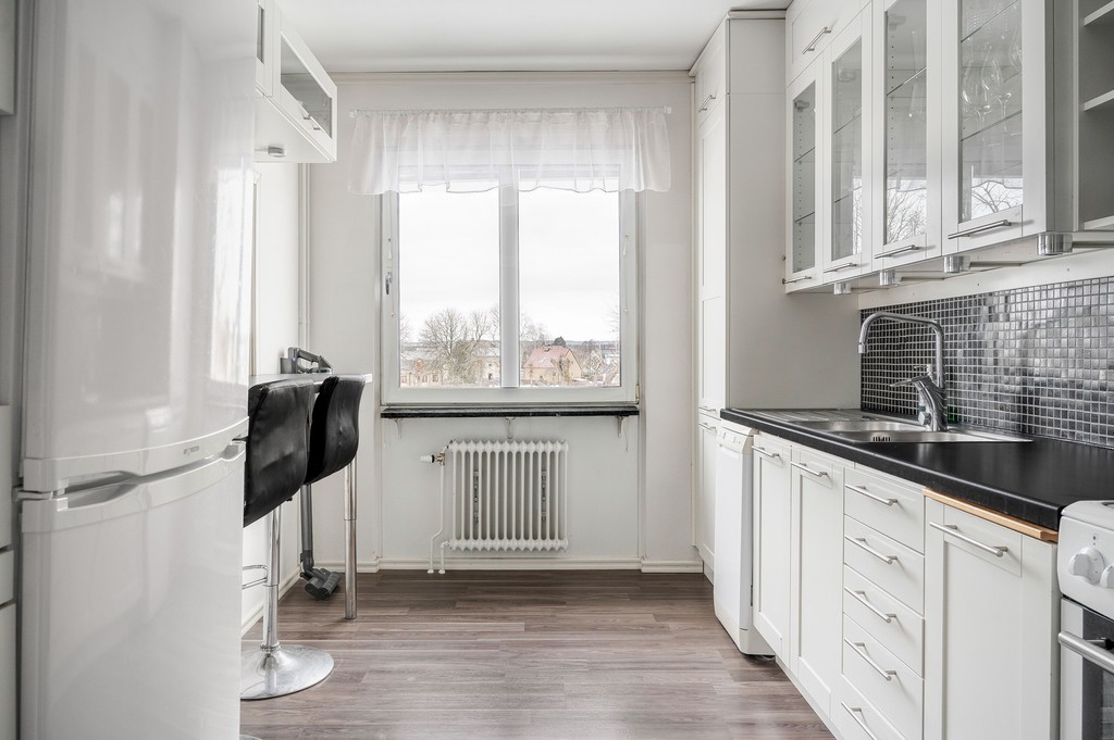 Välkommen till denna välplanerade och trivsamma lägenhet om 3 rum och kök, fördelat över 69 kvm men som upplevs rymligare tack vare sin genomtänkta planlösning och generösa ljusinsläppet. Bostaden är belägen på våning 2 i attraktivt gavelläge, vilket ger extra ljus och en härlig rymd. Redan i den stora hallen möts du av gott om förvaring i praktiska skjutgarderober. Köket är stilrent renoverat med inredning från Marbodal och ligger öppet mot vardagsrummet - en social och inbjudande yta. Från vardagsrummet nås balkongen med rofylld utsikt mot Stadsparken. Lägenheten erbjuder två rymliga sovrum med plats för både säng och förvaring. Det renoverade badrummet är fräscht och modernt med grå våtrumsmatta. Genomgående behagliga färgval på väggarna skapar en lugn och harmonisk känsla i hela bostaden. Här bor du centralt med närhet till service, kommunikationer och grönområden - ett hem att trivas i från första stund.