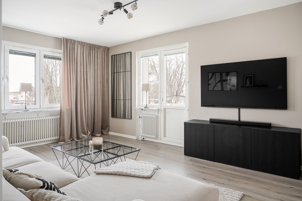 Ljust vardagsrum med fönster i två väderstreck. Utgång till balkong med vy mot Stadsparken.