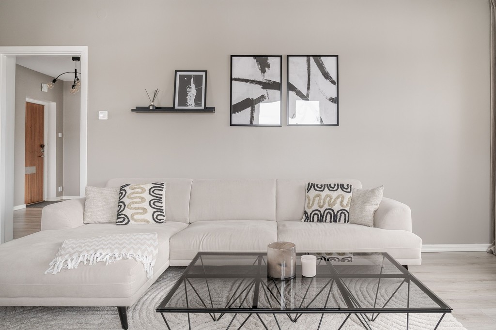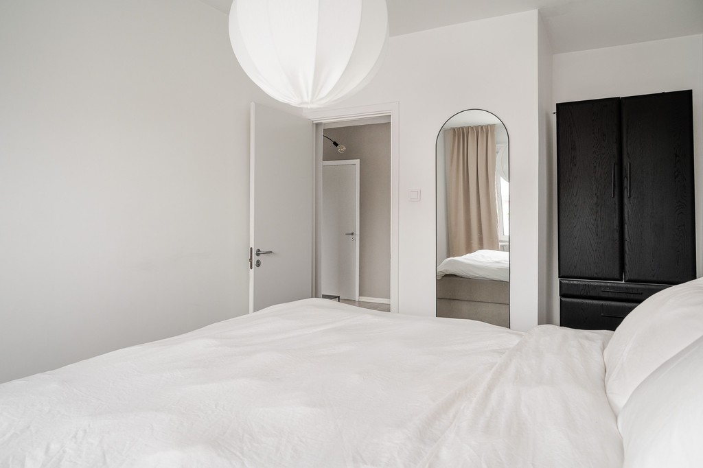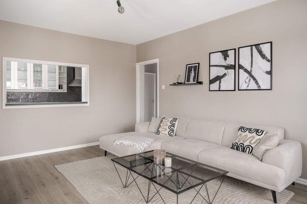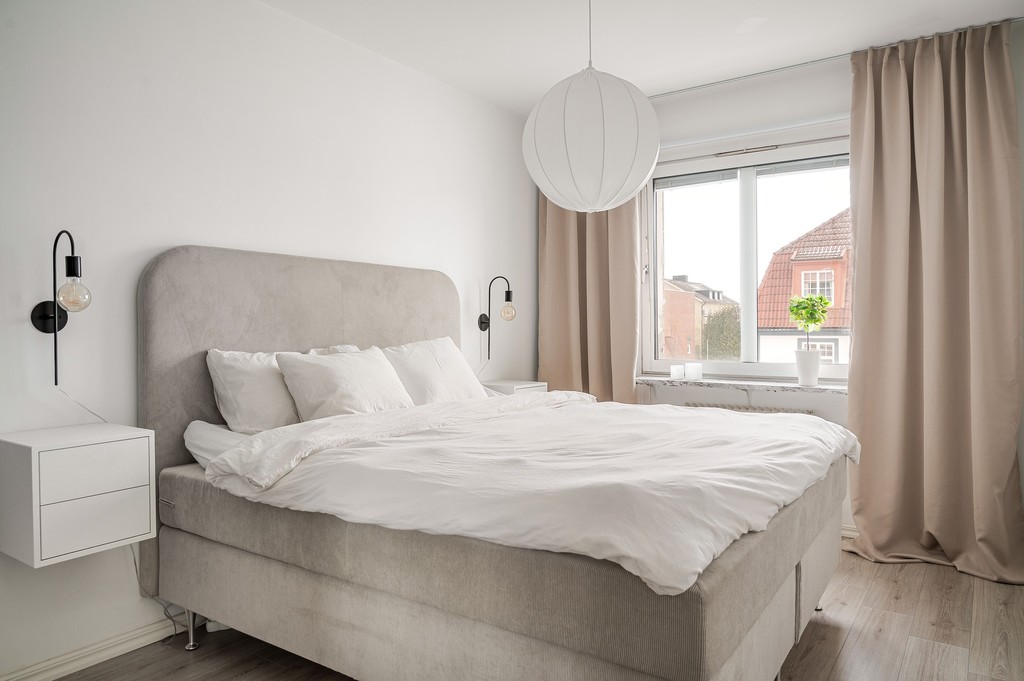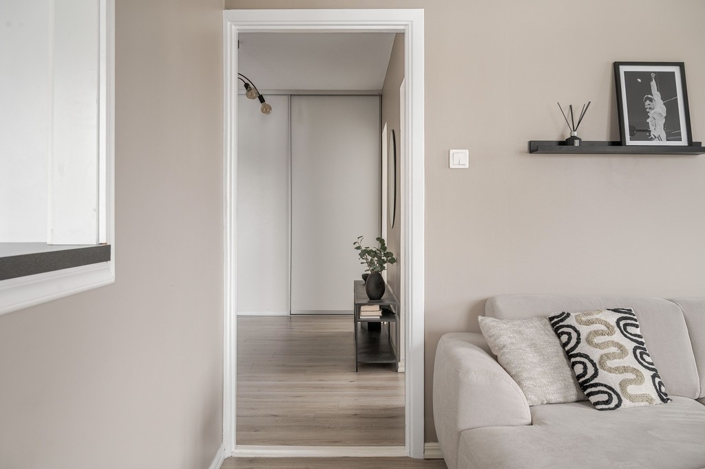 Lägenheten erbjuder två rymliga sovrum med plats för både säng och förvaring. Det renoverade badrummet är fräscht och modernt med grå våtrumsmatta. Genomgående behagliga färgval på väggarna skapar en lugn och harmonisk känsla i hela bostaden.