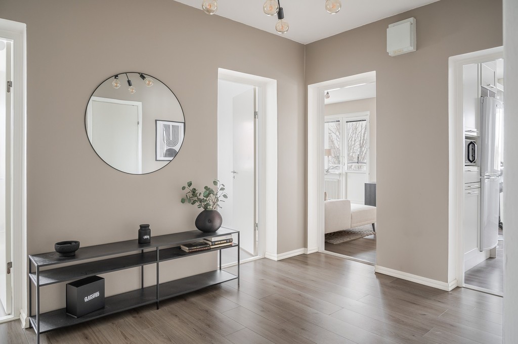 Välkommen in i den rymliga och ljusa hallen. Här ligger laminatgolv och bra förvaringsmöjligheter tack vare rejäla skjutgarderober.